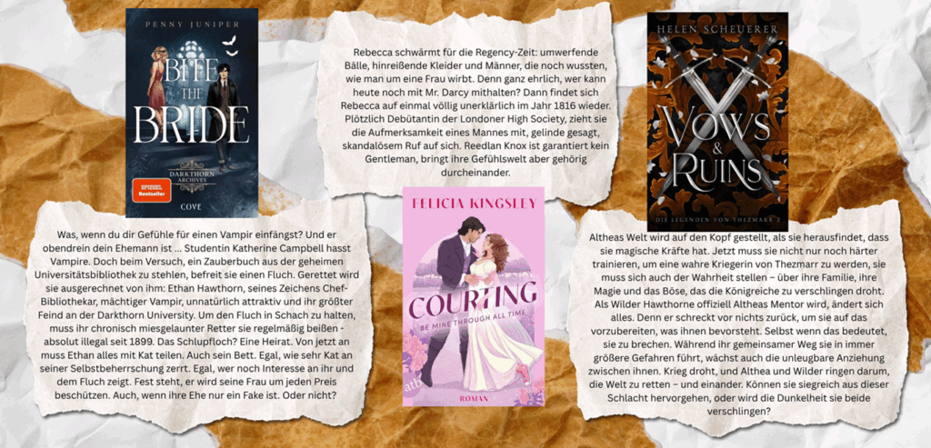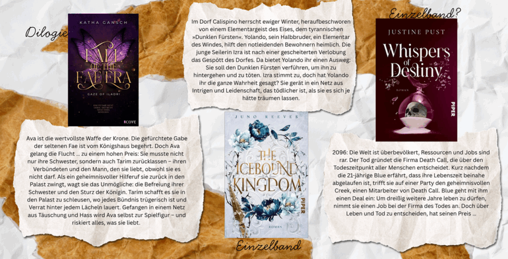 Die neuesten drei Schätze sind alles Rezensionsexemplare. „Fall of the Fae Era“ habe ich erhalten, da Isbel im Bloggerteam von Katha Gansch ist. Schaut euch da gerne mal bei Insta um. Die Mädels im Bloggerteam sind echt kreativ. Aber das Buch liest Isbel aktuell neben dem Buch „For Whom the Belle tolls“. Und über Netgalley habe ich vom Piper Verlag „The Icebound Kingdom“ und „Whispers of Destiny“ erhalten.