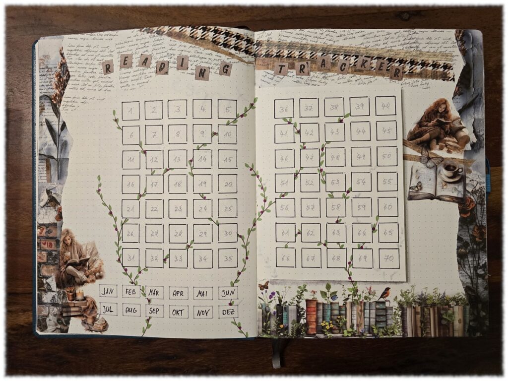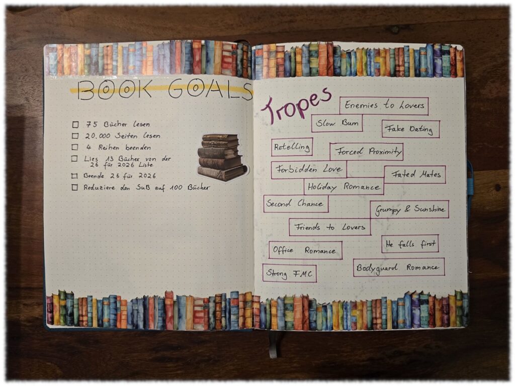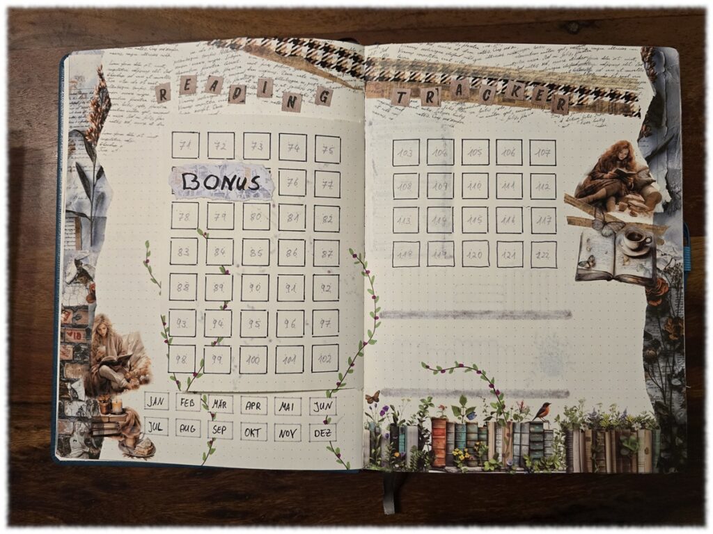 Nachdem ich mein Deckblatt gestaltet hatte, wie ihr es im Beitragsbild oben sehen könnt, habe ich mich an meine Leseziele gesetzt und bin nicht ganz so zufrieden mit der Seite. Vor allem die linke Seite werde ich, denke ich, nochmal überarbeiten, indem ich schaue, ob ich da ein Motivblatt drüberkleben kann. Das „100 Bücher“ ist ja leider etwas ungünstig.